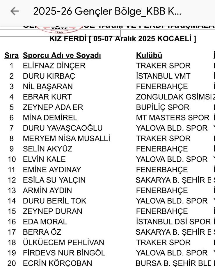 Ferdi müsabakalarda ise yaklaşık 100 kız sporcu arasında Elifnaz Dinçer Şampiyon olmuştur , Meryem Nisa Musalli 8. ve Ülküecem Pehlivan 18. olarak Türkiye şampiyonası ve milli takım seçmelerine katılma hakkı kapanmıştır